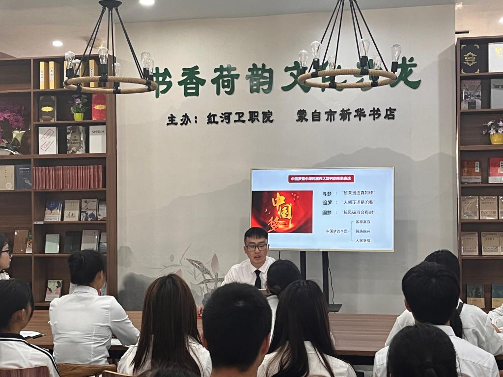 王海东老师从《复兴文库》的丛书简介、内容选读、序言学习三个方面进行书籍的分享。首先,以中央政治局常委同志参观《复兴之路》展览为导入,指引学生如何正确理解“复兴”,引出实现中国梦与中华民族伟大复兴的关系,旨在让学生读懂“复兴”二字,在新征程的起点上更好地坚定历史自信。此外,介绍了该书籍出版的背景、意义和成书过程,指明其是一部围绕民族复兴为主题,以思想史为基本线索编纂的大型历史文献丛书,更是党中央批准实施的重大文化工程,讲述了中华民族走向伟大复兴的历史逻辑、思想源流和文化脉络。其次,带领学生共同选读《复兴文库》第三编中《独立自主的和平外交》的相关内容,阅读了“中国人民愿意同世界各国人民实行友好合作”和“新中国的外交”两篇文选,选取党的二十大报告中关于和平外交政策的原文进行讲解,分析了在国内外的新形势下中国特色的大国外交,并通过相关案例加以阐释,揭示了新时代中国的国际地位和形象以及对世界的积极影响。最后,让全体师生一同感悟习近平总书记为《复兴文库》所作的《序言》,即“在复兴之路上坚定前行”,提出这套书籍正如习近平总书记所说,是具有重要历史价值和时代意义的珍贵文献,并在互动环节让学生代表起来分享自己学习的心得体会,展现出了红卫学子作为医学生有着救死扶伤的责任与担当。