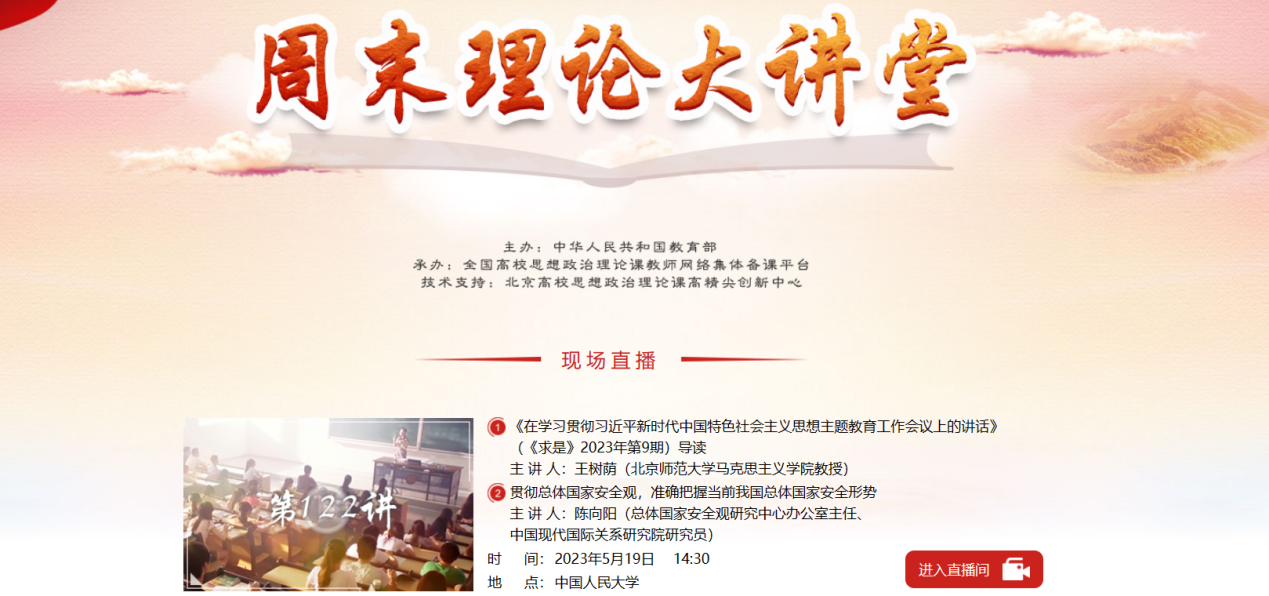 本月的“周末理论大讲堂”课程主要围绕着《当前经济工作的几个重大问题》(《求是》2023年第4期)、《构建人类命运共同体十周年:理论深化、实践演进及未来展望》、《全面从严治党探索出依靠党的自我革命跳出历史周期率的成功路径》(《求是》2023年第3期)导读》、“三个务必”的理论与实践、《在学习贯彻习近平新时代中国特色社会主义思想主题教育工作会议上的讲话》、贯彻总体国家安全观,准确把握当前我国总体国家安全形势、《在二十届中央政治局第四次集体学习时的讲话》导读 (《求是》2023年第10期)、建设巩固国防和强大人民军队等专题内容展开。除此之外,周末理论大讲堂还增加了上好思政课的方法的讲解,本月对通过思政课教学语言转化把道理讲深讲透讲活、把红色音乐作品融入思政课的思考与实践和思政课教师如何学哲学、用哲学的内容进行了讲解。