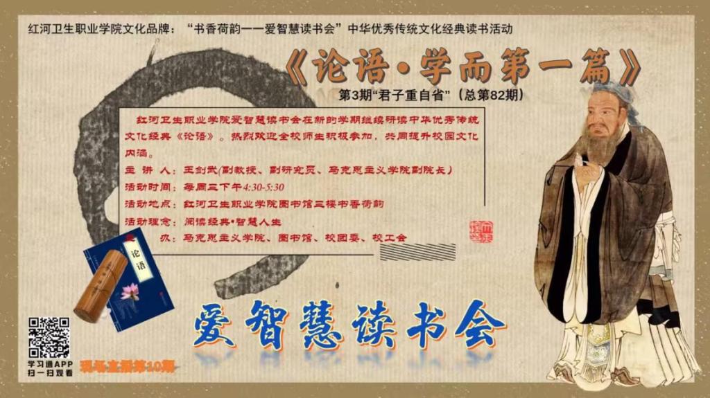 本学期的研读经典书籍为中华优秀传统文化第一经典—《论语》。在第80期、81期、82期读书活动中,王剑武老师分享了研读中华优秀传统文化经典的重要意义,对《论语》内容进行了全方位的讲述,并结合自己的成长实际,鼓励同学们要多读经典文本,感悟人生,树立正确的学习态度,把握为人处世的方式,做一名心有仁爱的医务工作者。