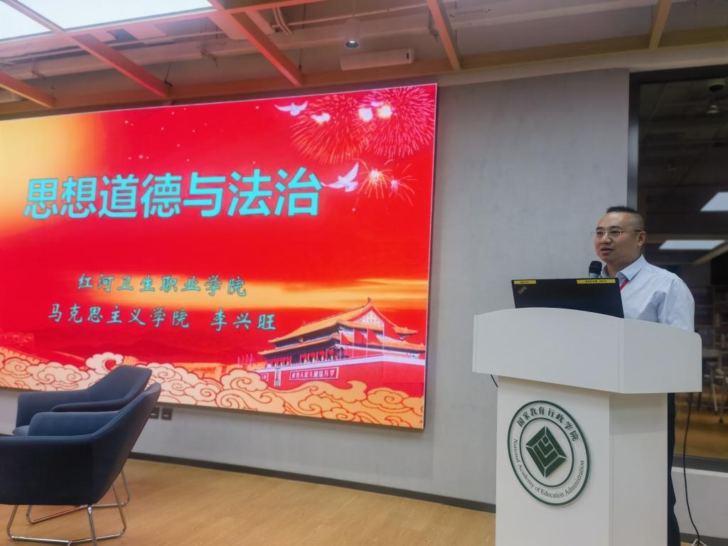 为进一步提高马克思主义学院建设水平和思政课教师教育教研能力,2025年7月20日至28日,马克思主义学院副院长李兴旺赴北京参加教育部高校思政课骨干教师研修班(院长轮训班第7、8期)集中学习研修。整期活动既有来自教育部的最新指示要求,也有来自权威专家专题教学的实践指导,更有特色鲜明的经验交流,不仅在方法论上作了有益指导,更是在价值自信上得到了充分认同。作为全国高职院校思政课教师代表,他在本次研修学习的专题研讨沙龙环节中,以“《习近平与大学生朋友们》一书如何有效融入日常思政课教学”为主题进行现场微课教学展示。“案例链锚定职业需求、情境化激活课堂张力”的教学设计,赢得参加活动全国专家们“紧贴职教特色、破解教学痛点”的高度评价,彰显我校在全国思政课改革创新前沿的探索担当。