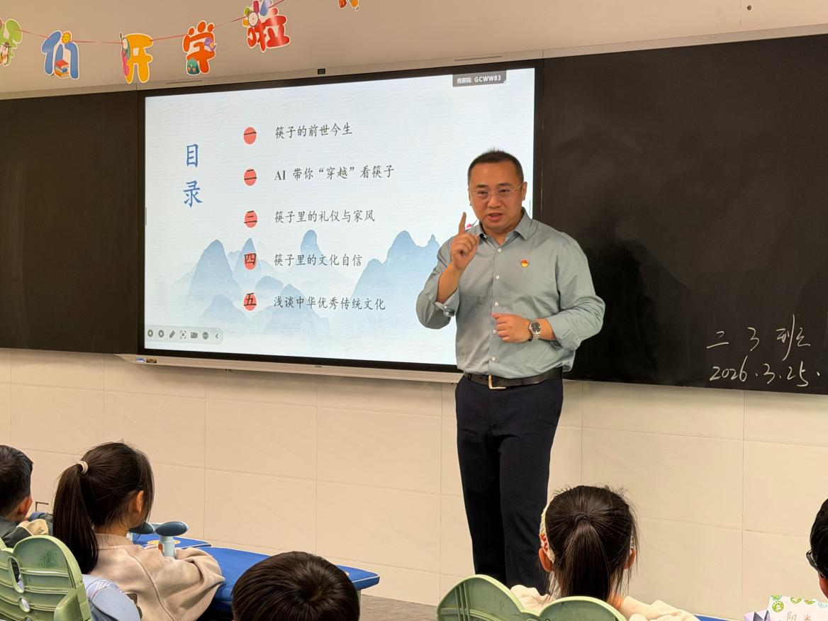 随后,活动进入核心环节。在二年级3班的课堂上,李兴旺院长为同学们带来了一堂题为《小筷子·大道理——从一双筷子读懂中华优秀传统文化》的精彩思政课。课程匠心独运,以“筷子”这一日常器具为小切口,展现文化传承的大格局。他从筷子的“前世今生”娓娓道来,借助AI技术生动“复原”历史场景,带领同学们“穿越”感受筷子的演变;继而深入浅出地解读了筷子中蕴含的礼仪规范、家风家教和文化内涵,由此引申至其承载的文化自信与中华优秀传统文化的博大精深。课堂通过“以小见大”的方式,使小学生们深刻理解了筷子作为文化载体的意义,并快速增进了对中华优秀传统文化具体表现形式及本土文化的深刻认知。
