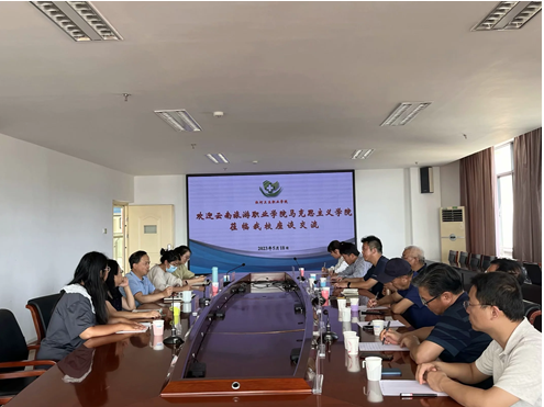2023年5月18日下午,云南旅游职业技术学院马克思主义学院副院长黄绍勇一行8人到我校考察交流,主要针对马克思主义学院建设、思政课建设、思政课教学能力大赛经验等内容进行调研考察交流。学校党委委员、副院长杨军和马克思主义学院教师代表参加了本次交流活动,座谈会由马克思主义学院党支部书记、院长邱林主持。
