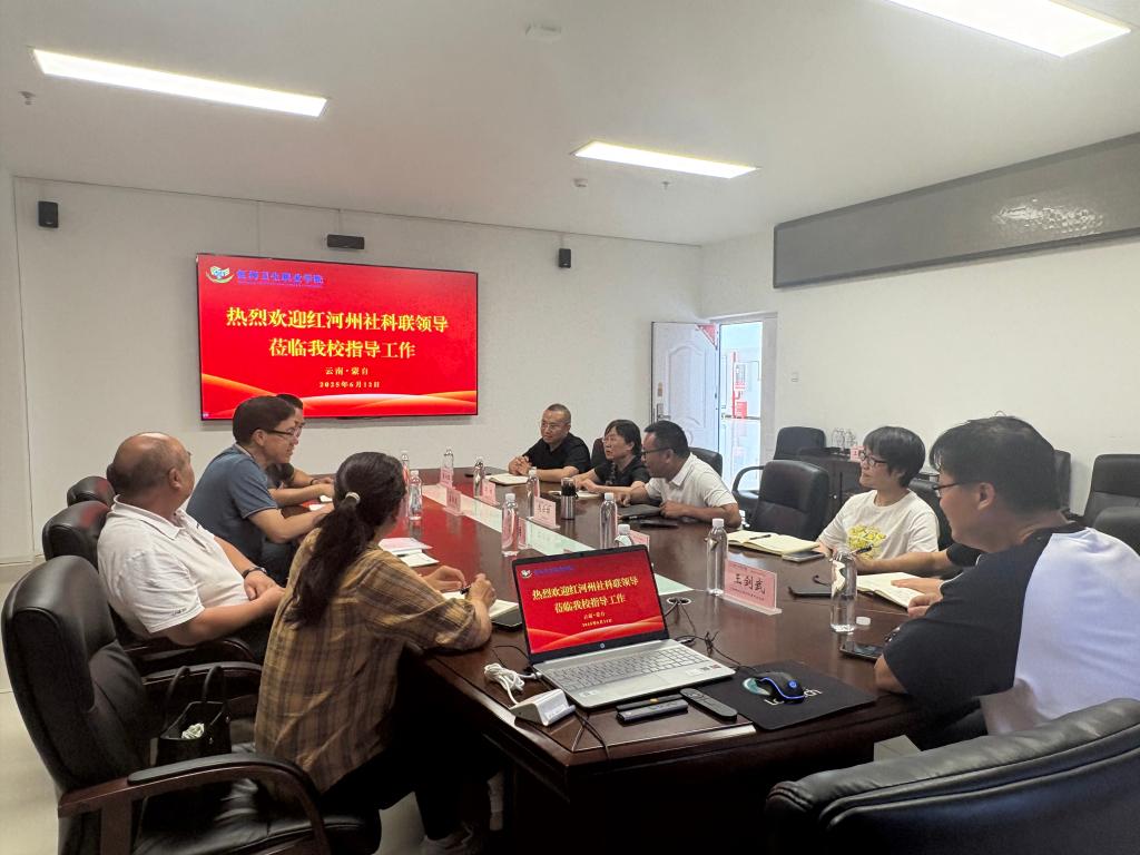 6月12日下午,红河州社科联党组书记、主席,州社科院院长吴昊华率队一行5人莅临我校,就相关事宜开展交流座谈。我校党委副书记周云雄、马克思主义学院院长邱林、马克思主义学院副院长李兴旺、宣传部部长王宏杰、高职教育与科研管理中心主任王剑武参加了会议。党委副书记周云雄对社科联领导一行的到来表示热烈欢迎,并表示此次社科联领导亲临指导,为我校哲学社会科学工作发展带来了新的机遇和动力。