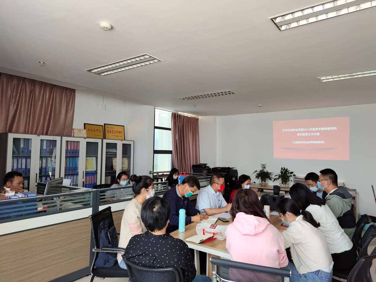 会上,马克思主义学院副院长李兴旺带领全体教师原文学习了师德师风相关文件材料,要求全体教师根据工作方案贯彻落实,对师德师风进行再研究、再部署、再排查,要在工作中做到严格要求自己,加强师德修养,提高教学水平,牢记教师职责。党支部组织委员李逢俊对五起教育违法犯罪典型案例进行传达和警示教育,要求全体教师进一步增强教师的责任感和使命感,坚守住教师底线,弘扬优良师德师风。