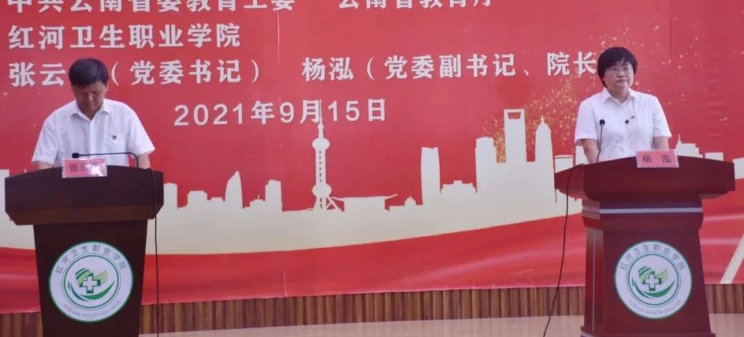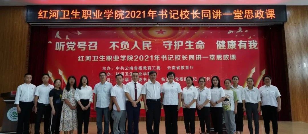 为深入学习贯彻习近平总书记在庆祝中国共产党成立100周年大会上的重要讲话精神,进一步贯彻落实中共中央办公厅、国务院办公厅印发的《关于深化新时代学校思想政治理论课改革创新的若干意见》和《中共云南省委教育工委云南省教育厅关于组织全省学校党组织书记校长同讲一堂思政课的通知》要求,充分发挥学校思政课作为立德树人根本任务的关键课程作用,上好2021年秋季学期“开学第一课”。2021年9月15日下午,红河卫生职业学院通过“线下课堂+线上直播”的方式,开展了“红河卫生职业学院2021年书记、校长同讲一堂思政课”活动,活动由我校专职思政教师、马克思主义学院副院长李兴旺主持,150余名师生代表在主课堂参加活动,全校近8000名师生同步观看视频直播。