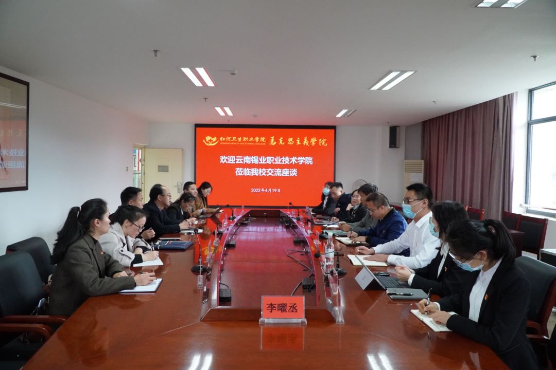 2022年4月19日下午,云南锡业职业技术学院党委书记张鹏一行到我校参观交流,主要针对思想政治理论课建设情况进行交流座谈。学校党委书记张云学和马克思主义学院教师代表参加了本次交流活动,座谈会由马克思主义学院副院长李兴旺主持。