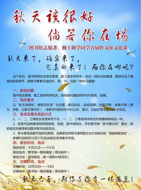 1、此次征文活动主要是针对所有图书馆志愿者、勤工助学同学(含助学金、助学贷款同学),也欢迎全校同学参与报名、投稿(不管老生、新生);
