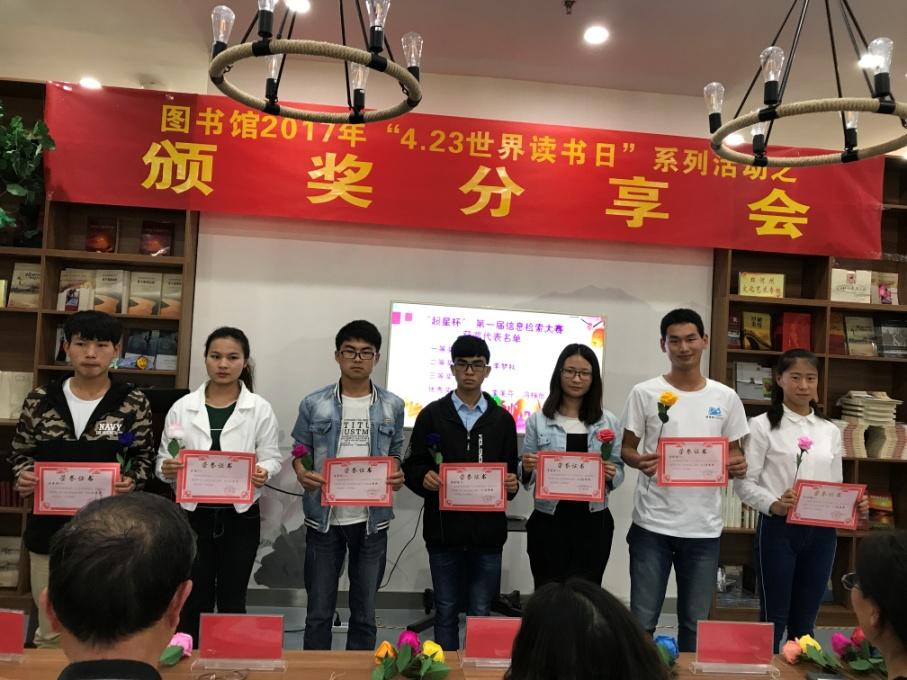 此次颁奖分享会由赵健美老师主持,是对图书馆已经结束的4个读书活动作一个总结和表彰,分别邀请了获得“超星杯”第一届信息检索大赛、经典在线——第一期微书评大赛、第三届“书香光影”之最美校园摄影大赛,以及图书馆第三届“阅读之星”荣誉称号的获奖代表分享了活动心得和体会,并由图书馆老师为同学们颁发了礼物:图书馆老师精心设计制作的“4·23世界读书日”纪念书签、纪念玫瑰及获奖证书!