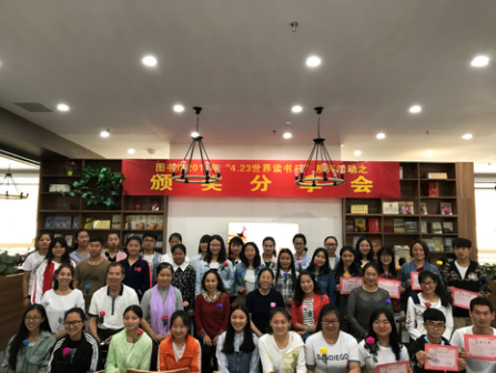 5月25日下午,图书馆“4.23世界读书日”系列活动之“颁奖分享会”在图书馆三楼“书香荷韵文化沙龙”举行,图书馆老师及各项活动获奖同学代表一共44人参加了颁奖会。