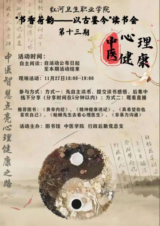 2024年11月27日星期三下午,由图书馆、中医学院、行政后勤党总支联合举办“书香荷韵——以古鉴定今”(第十三期),以“中医智慧:点亮心理健康之路”为主题,在图书馆三楼书香荷韵举行。现场参加读书会活动同学30余人,通过超星学习通观看视频同学584人。