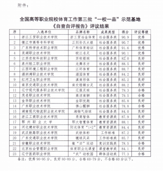 自2019年全国高等职业院校第三批“一校一品”示范基地立项以来,学校积极推进品牌“滇南形体”的“真抓,真建,真引领”建设,实现“以评促建、以督促改、督诊结合、重在发展”的建设目标,有力推进高职院校体育工作协同创新发展,经专家评议,第三批“一校一品”示范基地立项项目负责人互评和综合评议,红河卫生职业学院评为“良好”等级。