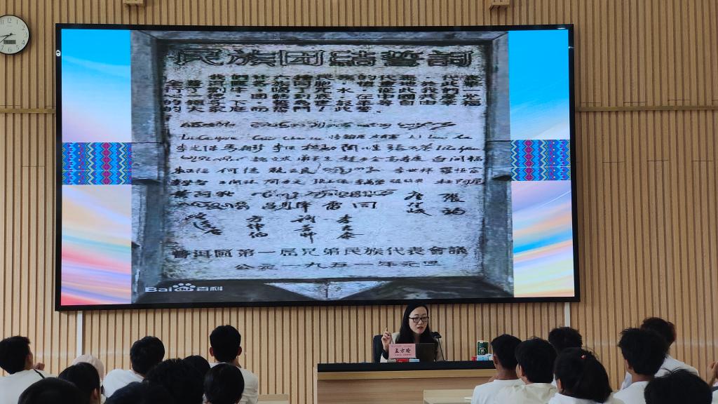 孟部长重点与师生们分享了“习近平总书记给普洱民族团结誓词碑盟誓代表后代的回信”,详细阐述了誓词碑的历史渊源及其背后云南各族人民像石榴籽一样紧紧抱在一起,共同团结进步,促进边疆的稳定和社会的和谐的动人故事。这些内容让大家深刻领悟到中华民族共同体意识的凝聚力和向心力。加深了师生们对中华民族的认同和归属感,激发了大家为实现中华民族伟大复兴的中国梦贡献力量的爱国热情。