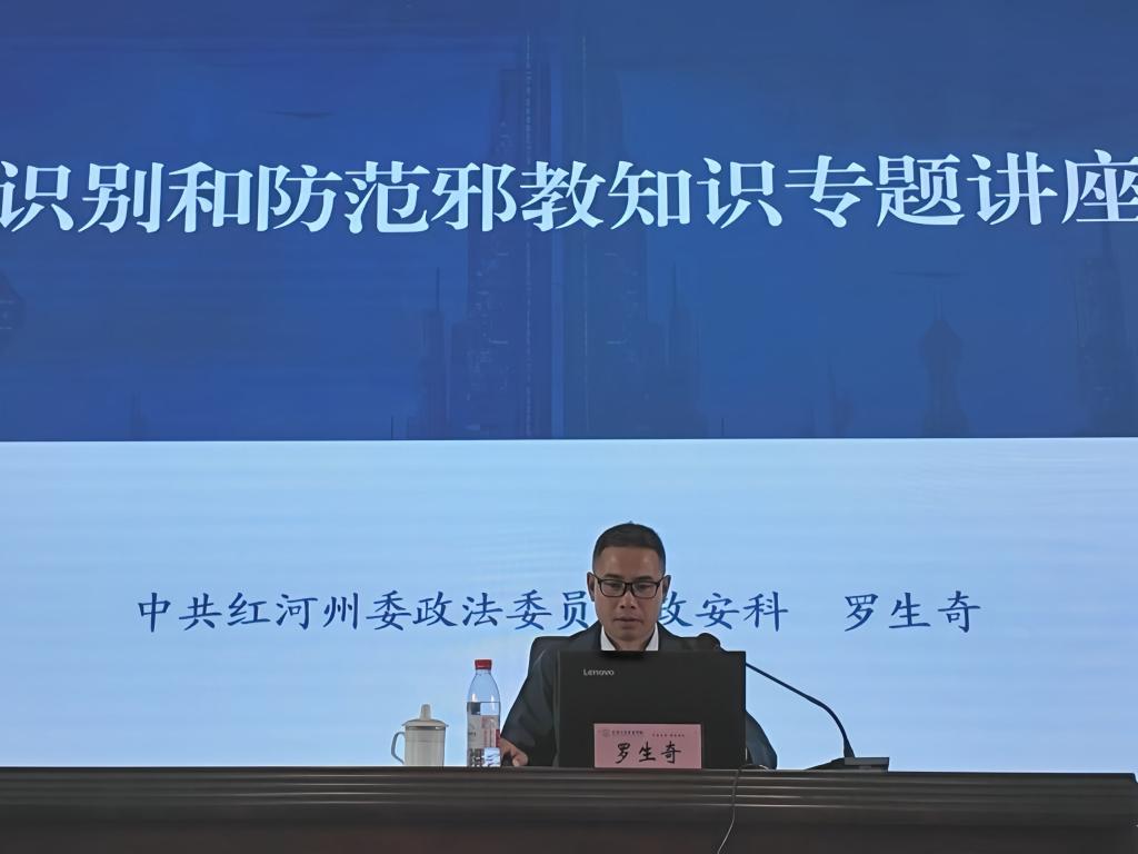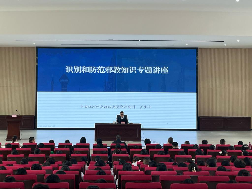 2024年11月20日,红河卫生职业学院举办识别和防范邪教知识专题讲座,邀请红河州反邪教警示宣讲团成员罗生奇主讲,学院党委委员、副院长李锋主持讲座。州教体局德育科主要负责同志、学院在家党政领导班子成员、各部门和二级学院中层干部、各党总支(支部)书记、辅导员、思政教师及学生代表等480余人参加讲座。