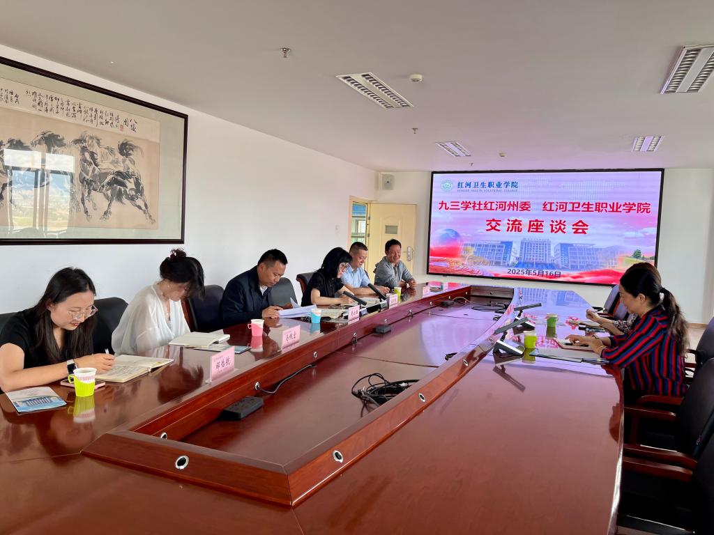 2025516,九三学社红河州委专职副主委高筱芳一行2人赴我校交流座谈。学校党委副书记周云雄,党委委员、统战部部长孟方瑜,学校九三学社社员参加交流座谈
