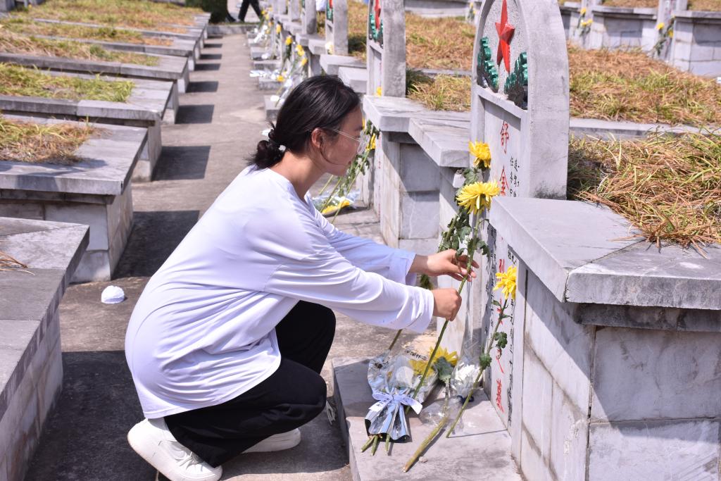 参加活动的师生,满怀崇敬和哀思,轻轻拂去烈士墓碑上的尘埃,献上菊花,寄托对革命先辈的诚挚敬意和深切怀念。