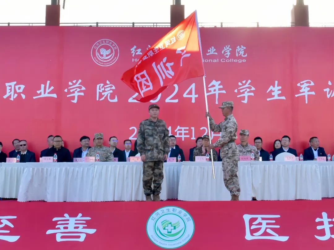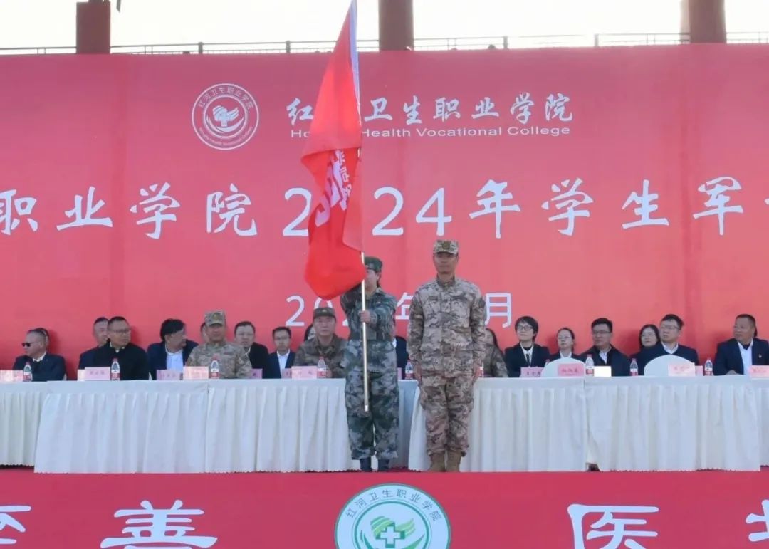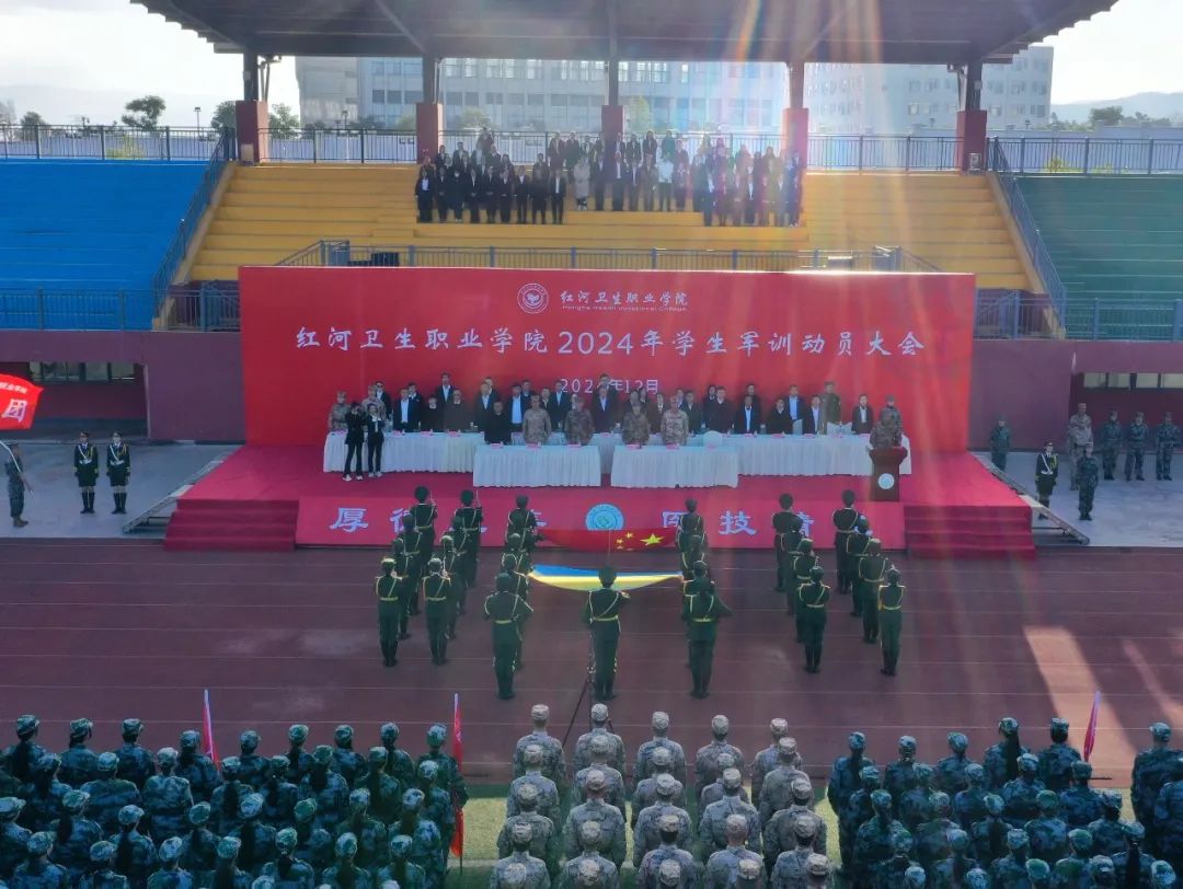 2024年12月2日上午9时,红河卫生职业学院2024年学生军训动员大会在田径场举行。武警驻蒙某部领导,蒙自市人民武装部领导,党委书记王必成,党委副书记、院长唐飚,党委副书记周云雄,党委委员、副院长朱有才,学校各部门、二级学院(部)负责人,全体辅导员、班主任,全体在校生和部队承训教官参加。朱有才副院长主持大会。