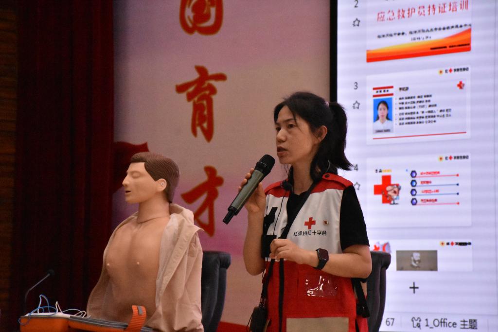 红河州阳光生命安全教育服务中心主任、红十字应急救护培训师李晓静对师生进行了应急救护知识培训,现场演示应急抢救流程。