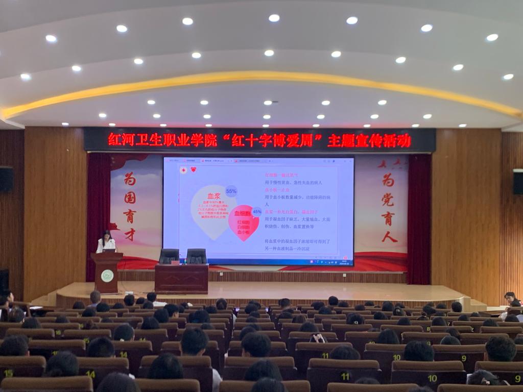红河州中心血站宣讲团曹宜瑾老师向师生科普了爱心献血相关知识,现场解答同学们关于献血方面的困惑,鼓励师生爱心献血,扩充国家血库。