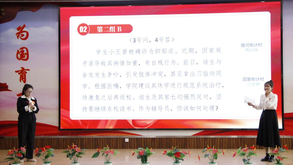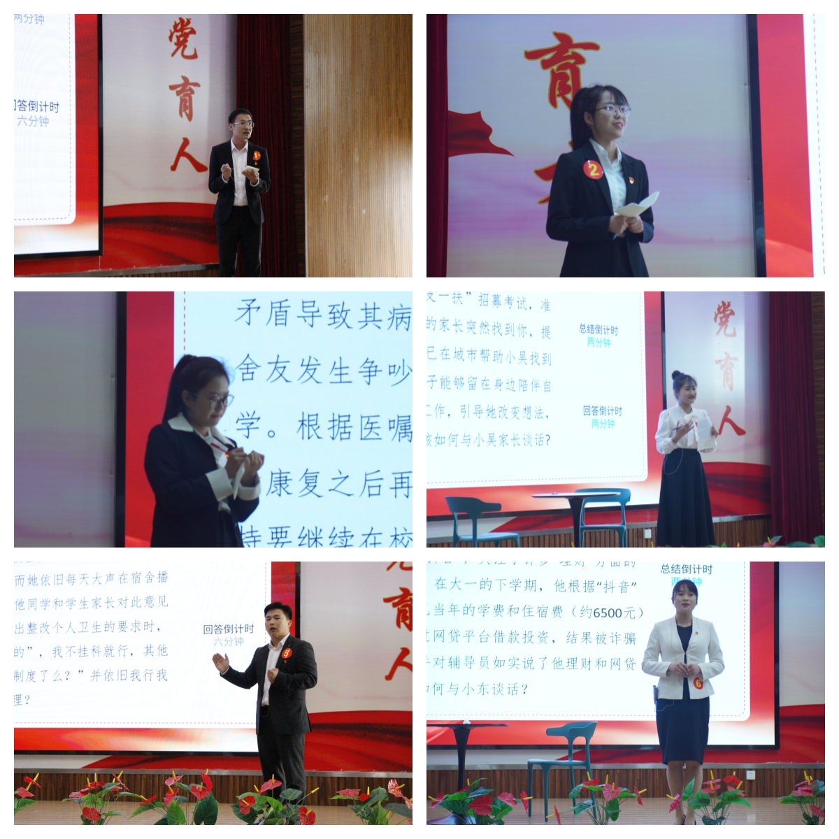 本次比赛共两个阶段三个环节。第一阶段为笔试环节,全体辅导员参加知识基础测试,测试采用闭卷作答,重点考察辅导员的理论素养和业务知识,从中筛选出6位优秀辅导员进入决赛环节。
