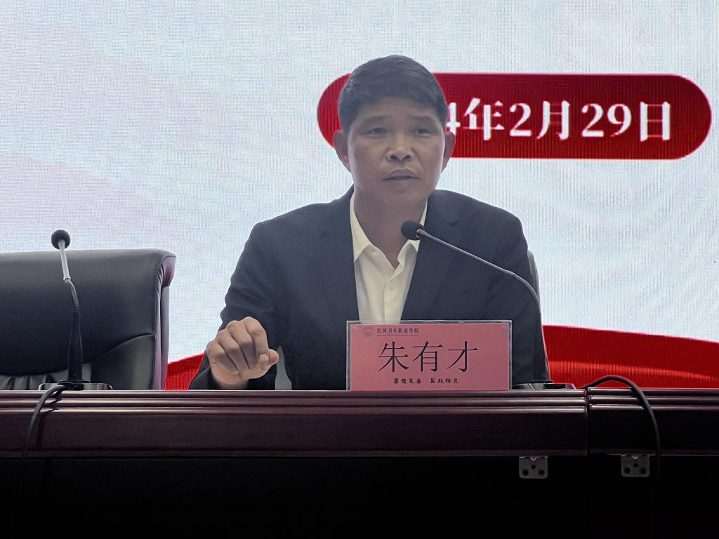 最后党委委员、副院长朱有才对2023年学生工作取得的成绩进行了回顾和总结,肯定了全体学工队伍在过去的一年里取得的突出成绩,分析了2024年学生工作面临的新机遇和新挑战。他对2024年春季学期学生工作作了重点强调,他强调:全校学工队伍要落实立德树人根本任务,紧紧围绕学校“557”重点工作任务,要聚焦安全教育,在十种安全方面上为学生身心健康进一步护航;要强化多措并举,在就业工作中进一步提升;要坚持用心用情,在教育学生成人成才上进一步夯实;要聚学生日常管理,在学生教育管理上进一步深入。