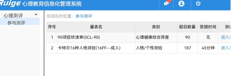 7 选择测试项目,点击“进入测试” 按顺序先做1.90项症状清单,后做2.卡特尔16种人格测验 |