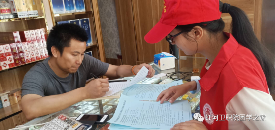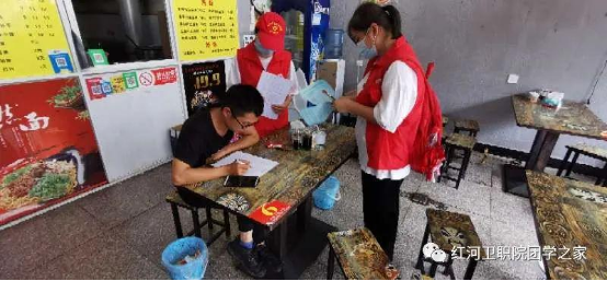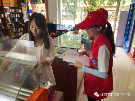 2020年6月10日15:00—17:00红河卫生职业学院“小喇叭”志愿服务队进入双河社区开展蒙自市创建全国文明城市市民应知应会社区商户入户宣传活动。