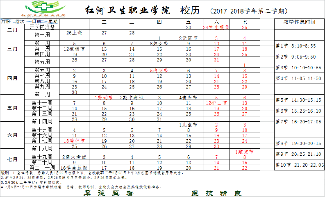 红河卫生职业学院校历(2017-2018学年第二学期)