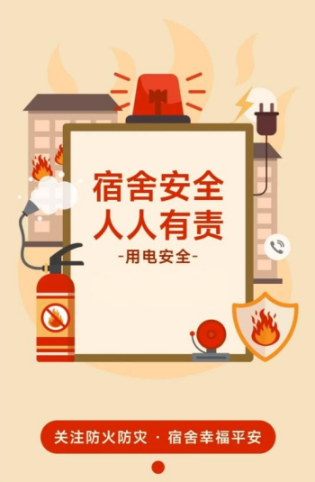 关于宿舍用电,同学们务必做到:不在宿舍使用违规电器、燃明火,严禁用湿手触摸电器以防触电,严禁乱拉私接电线电源,严禁长时间对手机、充电宝等设备充电,离开宿舍时关闭电源,做到“人走断电”。让我们一起防患于未“燃”。