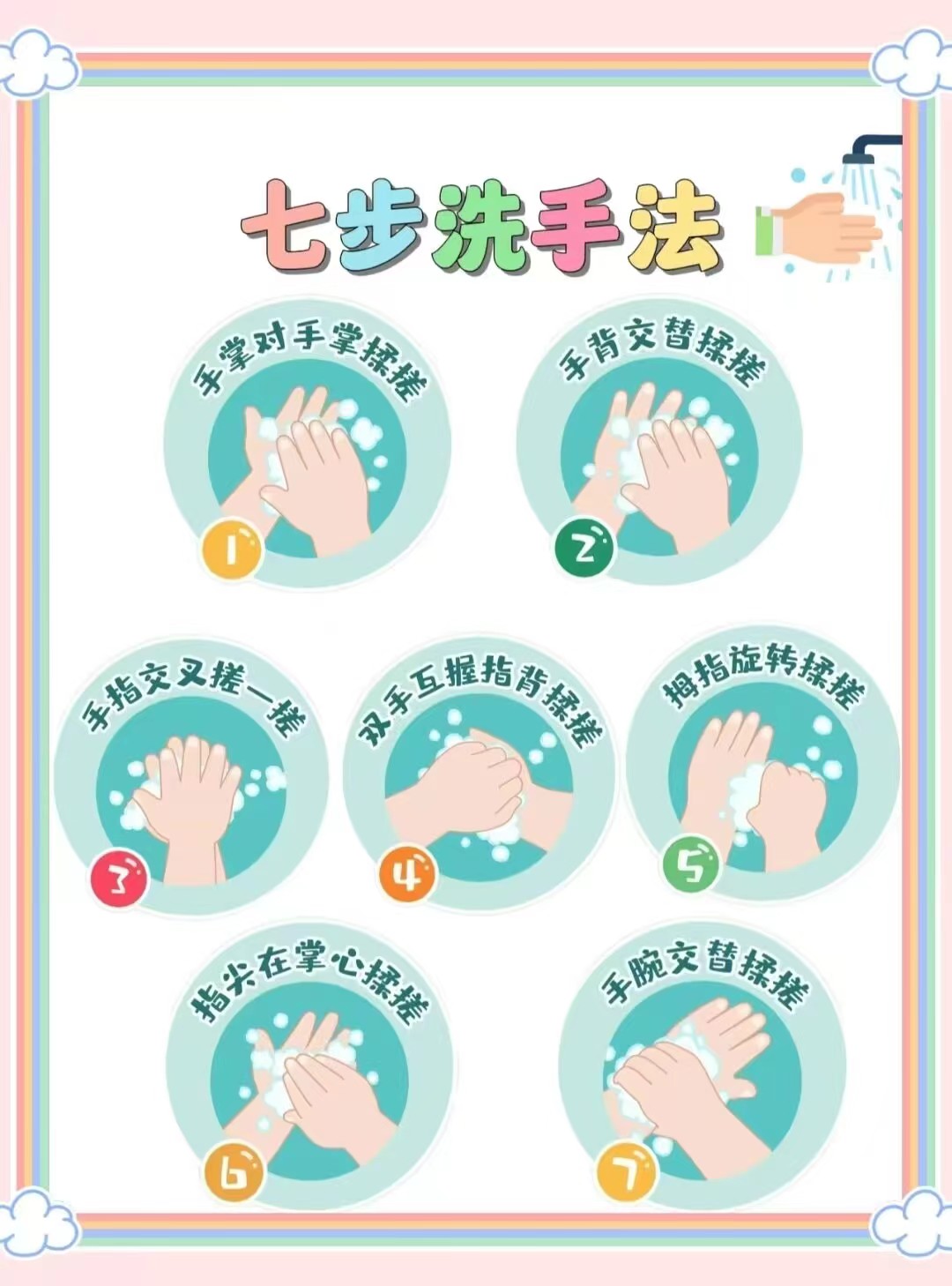 洗手步骤的七字口诀:内、外、夹、弓、大、立、腕。