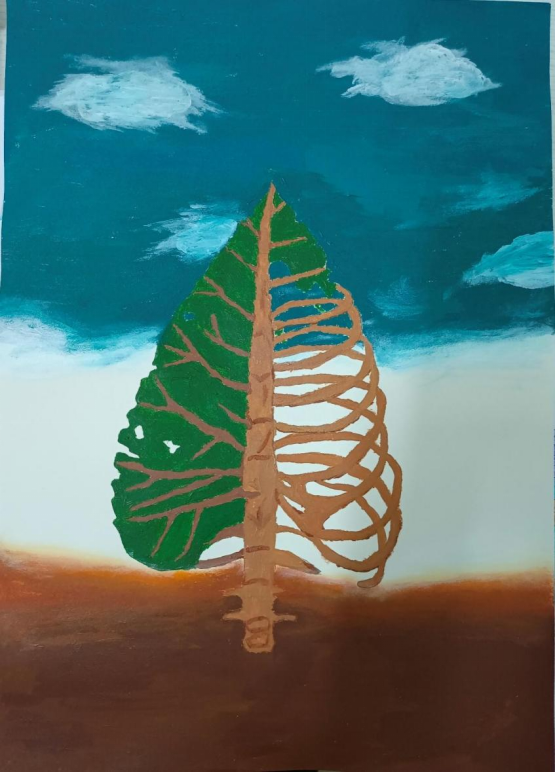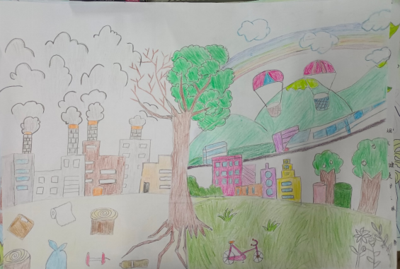 也许人会说环保离我们很远,“大自然—绿色—环保—人—自己”其实大自然就在我们的周围,绿色就在我们身边,环保就在我们心中,手中,脑中。我的这幅作品用现代房屋建设和绿色房屋建设作了对比,和画面下方画出了大自然的美好。突出了在现代化强国道路中,我们会常常忽略一些环境问题,当一片片绿波汹涌的森林被无垠的荒漠黄尘所取代,当无忧地在蔚蓝的天空飘荡的白云被漫天滚滚黑烟所替代时我们该意识到我们是生活在大自然中,应给予大自然保护。