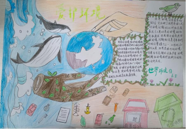 我们在手抄报上画了垃圾桶、自行车、还有地球。垃圾桶的意义在于我们要学会垃圾分类,提高垃圾的资源价值和经济价值,做一名垃圾分类小能手;自行车的意义在于低碳出行,争做低碳环保、绿色出行的宣传者,低碳生活,绿建未来;地球的意义在于我们要保护自然,顺应自然,尊重自然,共建一个绿色家园。