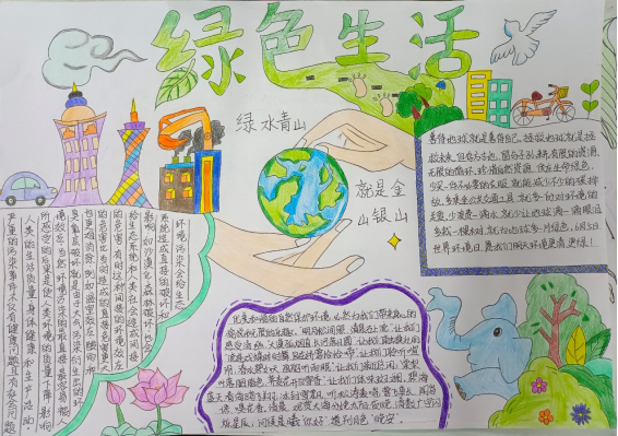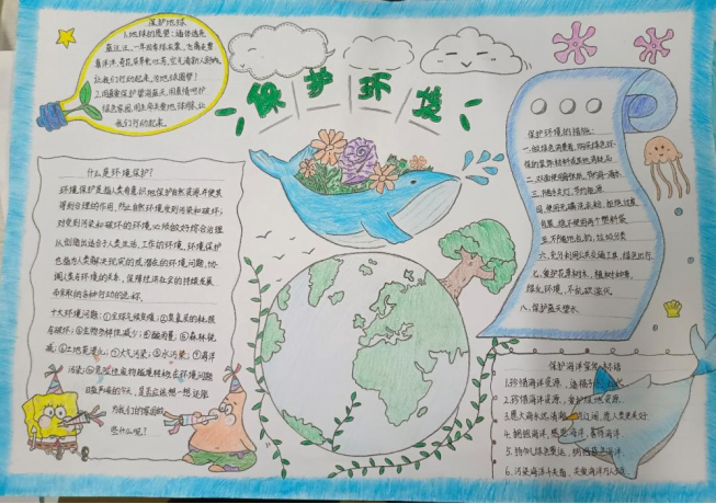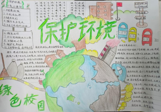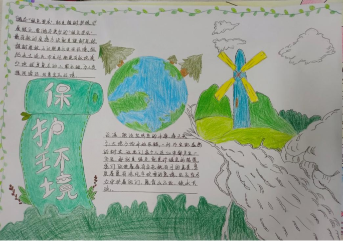 因为是保护环境主题,所以手抄报整体色调为蓝绿色。手抄报上面是被绿色蓝色包围的地球,风车河流是为了告诉人们低碳生活给人们带来的好处。保护环境是一种态度,而不是一种能力。所以希望我们能尽我们的所能,让地球充满绿色,充满生机。