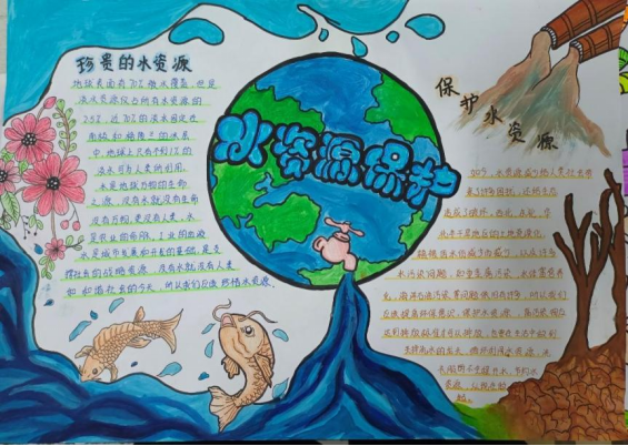 手抄报的名字是《水资源保护》3月22日“世界水日”,6月8日“海洋保护日”,可见水资源是多么重要,日出江花红胜火,春来江水绿如蓝。自古从今祖国之栋梁不可无,生命之水不可枯的大好河山都被潺潺的水流不断滋润着,映衬万物为世间的。所以我们应该保护水资源。