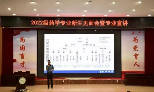 党总支副书记孙雨诗同志结合本校实际及专业建设情况,从药学院的发展历程、师资力量、人才培模式、就业面向等方面进行了全面的阐述。并呼吁新同学们开始学会对未来进行思考和规划,在仰望星空的同时学会脚踏实地。