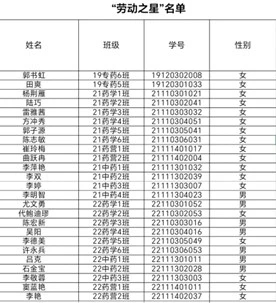21药营1班崔玲梅,她是药营联盟社的社长,以“不要惧怕自己的不足 ,那是努力的开始”要求自己,在劳动中努力,在实践中学习,同时带领部门响应学院号召,实践劳动精神。除了以上同学还有很多的同学没有介绍,但毫无例外他们都将劳动至上的理论付诸于行动中,希望同学们能以这些劳动模范为榜样。