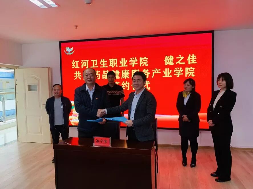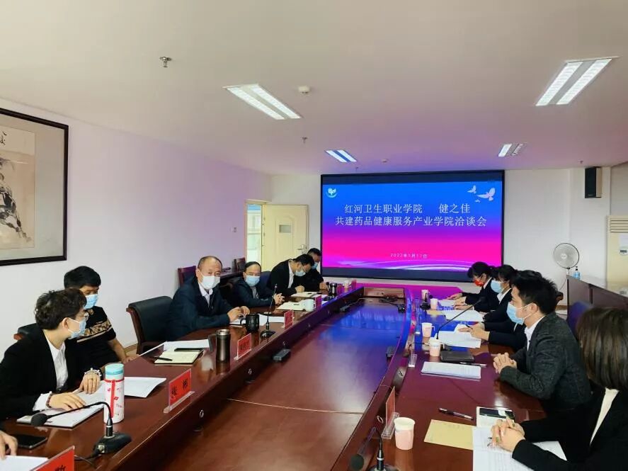 为深化产教融合,培养适应现代产业发展的高素质技术技能人才,2022年5月17日下午红河卫生职业学院与云南健之佳健康连锁店股份有限公司(以下简称健之佳)举行共建药品健康服务产业学院洽谈会暨签约仪式,学校院长唐飚,副院长杨军、朱有才、相关部门负责人及药学院党政领导参加了签约仪式。