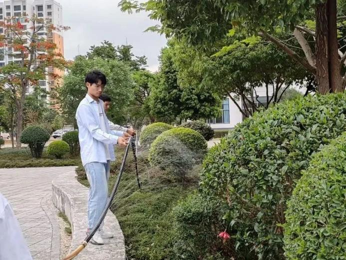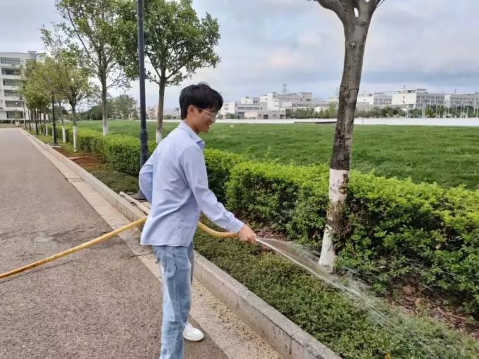 同学们先重点对绿化带区域内的枯枝落叶和区域地面垃圾进行初步清扫,继而对绿化带植物进行浇水,大家热情高涨,相互合作,在校园中寻找那一棵棵焦急等待的花草绿植,伴着青春的梦想为之浇灌。浇水过程中,同学们分工明确,配合默契,呈现出一幅热火朝天的劳动画面,随着水慢慢地渗入泥土中,空气里渐渐散发出泥土的芬芳。同学们看着自己的劳动成果,露出了会心的笑容,在汗水的挥洒中体会到了劳动的乐趣。