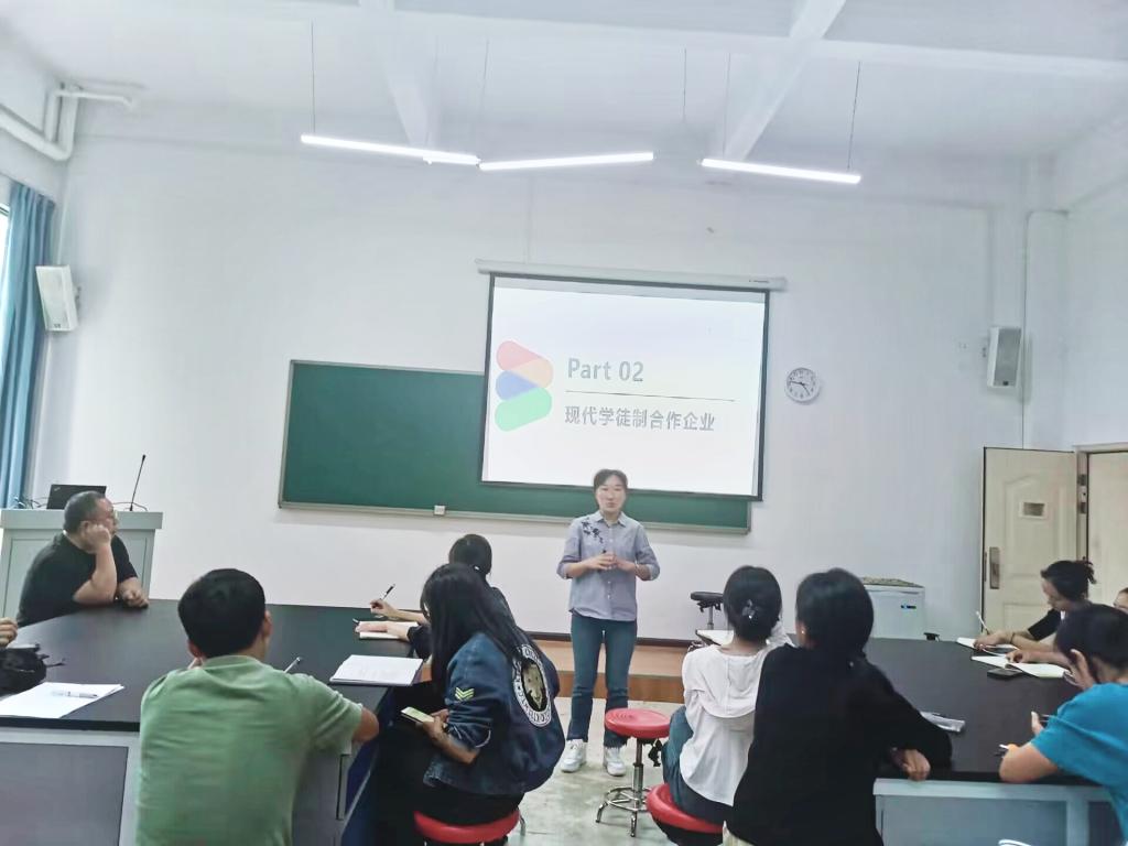 首先,阳院长对现代学徒制做了介绍,党的二十大报告对职业教育提出了新要求,职业院校要大力开展校企双主体协同育人,深化现代学徒制改革。现代学徒制的优势体现在四个有利于:一是学生尽早接触企业专业相关岗位,利于提升操作技能;二是学徒期间的学徒补贴,利于减轻家庭经济压力;三是学徒提前对职业环境和企业文化有更深的认识,利于将来在企业的个人晋升;四是利于就业,学徒毕业即就业。