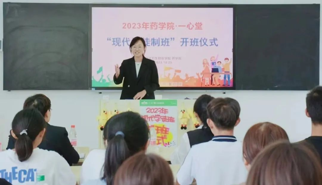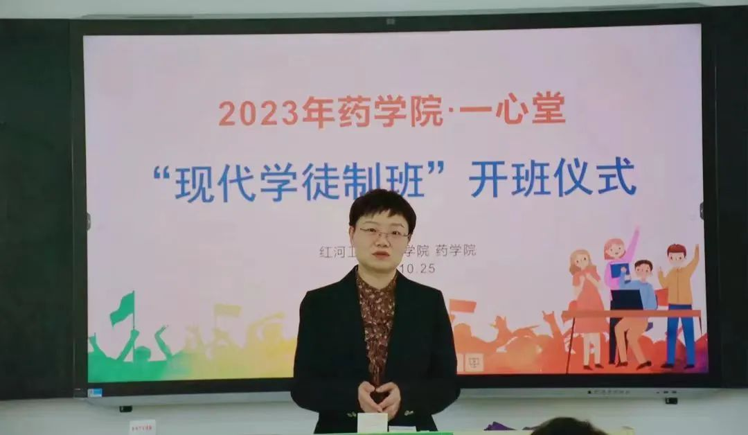为适应社会发展的实际需求,提高人才培养质量,促进校企联合的健康发展,一心堂的现代学徒制班通过前期的宣讲、报名、面试等工作,于10月25日正式开班了。参与开班仪式的有药学院党总支书记张郴,党总支副书记孙雨诗,一心堂红河一分部总经理段琳,红河一分部人事主管赵然,红河一分部人事管理员杨丽春,现代学徒制项目团队成员及2023年“一心堂现代学徒制班”全体同学,开班仪式由党总支副书记孙雨诗主持。