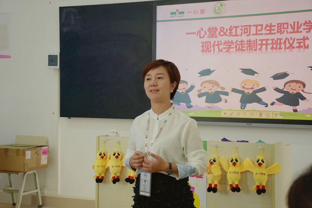 一心堂红河—分部总经理段琳在致辞中表示,现代学徒制是针对专业技术型人才和实践型人才的培养,更好地实现优化人力资源的目标,希望同学们能够在接下来的学徒制班中学有所获,学有所成!人事管理员杨丽春,讲述了一心堂研发团队及学徒制班老师躬耕药企的生动工作实践故事,希望参学同学在今后的学习中虚心向前辈学习,向优秀先进班组学习,真正把自己作为一心堂的一员,融入大家庭之中,同学们对一心堂有了更深的认识和了解。随后,杨丽春管理员与学徒制班的同学们进行了有奖互动,并发放了班服。药企互动气氛达到了高潮。开班仪式的最后,人事主管赵然组织同学们自我介绍,鼓励同学们相互认识,积极互动。同时也给现代学徒制班选出班委,为日后学徒制的顺利开展打下良好基础!