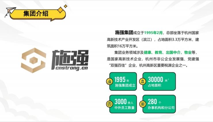 招聘会开始,浙江施强集团有限公司HRPB何霖艳详细介绍了公司的发展历程、企业文化、人才培养机制以及招聘岗位等方面的情况。施强集团于1995年成立,集团业务领域涉及健康、教育、出国中介、物业等,是国家高新技术企业,杭州市非公企业发展强、党建强“双强百佳 ”企业,是杭州高新区重要税源之一。