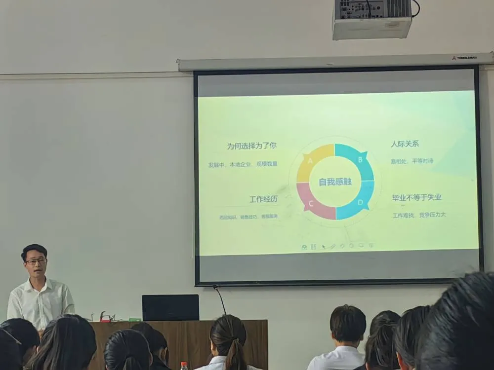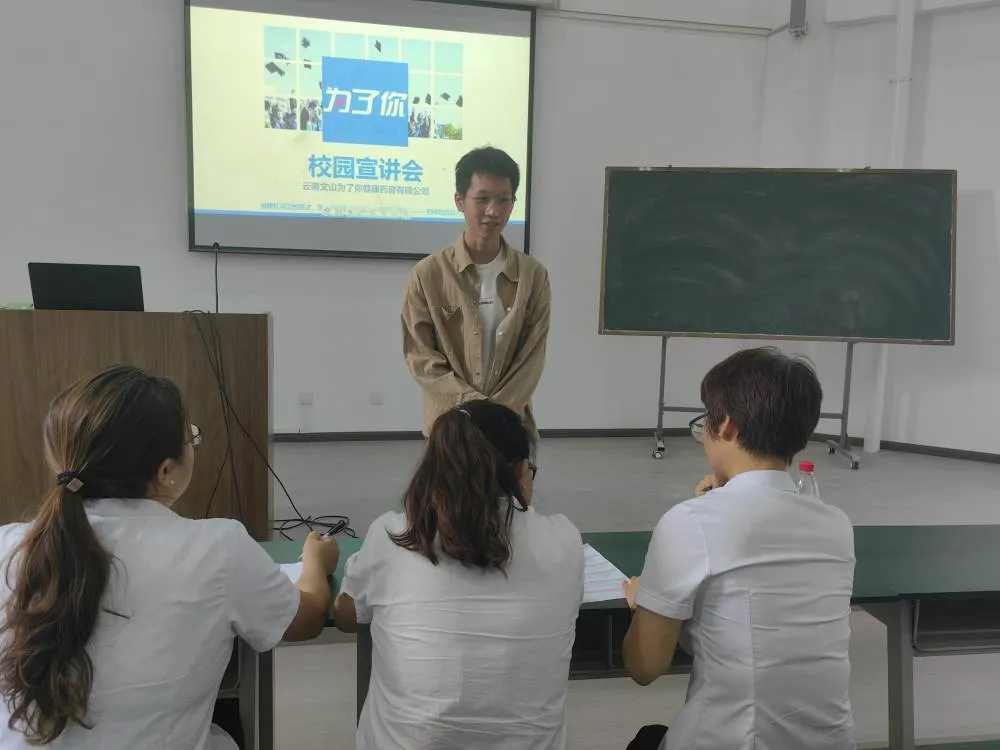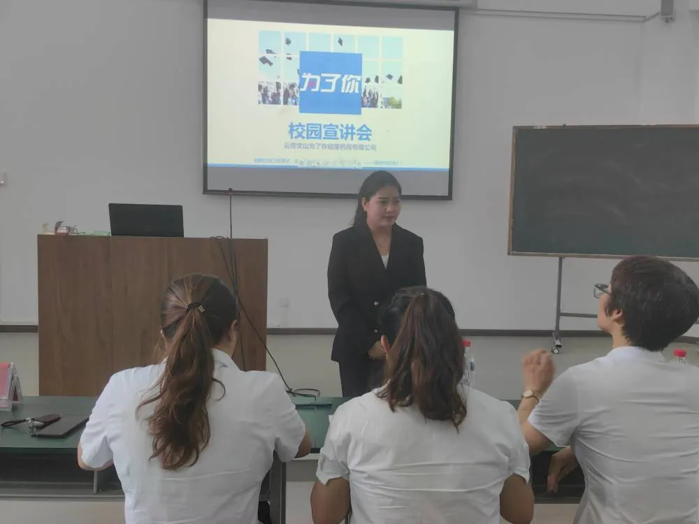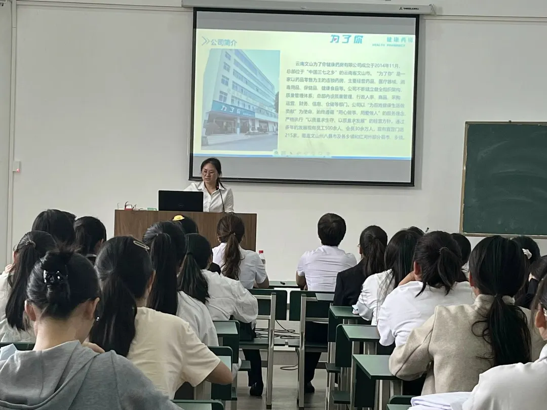 活动伊始,一段宣传视频开启了同学们对云南文山为了你健康药房有限公司了解的大门。接着,杨萍经理就公司环境和发展历程、机构组织、部门风采、员工福利与酬薪结构等向同学们做了详细介绍。学长王齐聪从自我成长经历、晋升发展空间等方面向同学们分享了他在云南文山为了你健康药房有限公司工作的感受与经历。