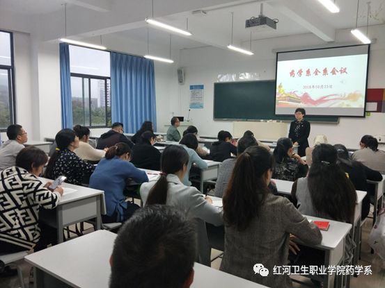 2018年10月23日下午4:20药学系全体教职工在教学楼南203召开会议,会议由两个部分组成,首先,药学系主任张郴老师对新进老师黄碧霞和杨瑶进行了介绍,并对本学期获得教学、微课和云课堂比赛的情况进行了通报,鼓励系部老师积极参与到各项比赛中,提升老师的综合技能。此外,张郴老师对校庆、现代学徒制、年终考核等工作进行说明和安排。