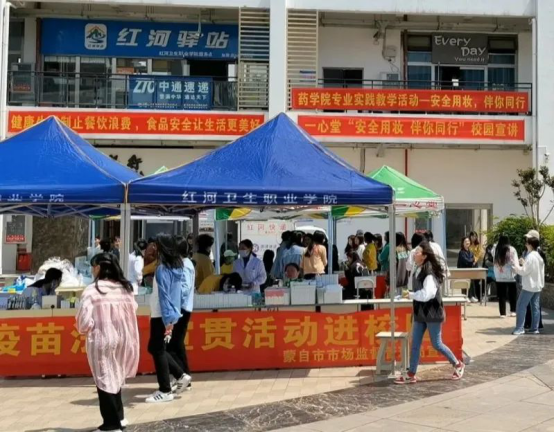 为增强药学院学生专业素养,提高学生专业实践能力,帮助同学们更好理解药事管理中化妆品的安全管理。2021年3月24日,药学院联合蒙自市市场监督管理局和一心堂红河州一分部在学校商业步行街开展“安全用妆,伴你同行”宣传活动及《药品管理法》普法宣传活动。