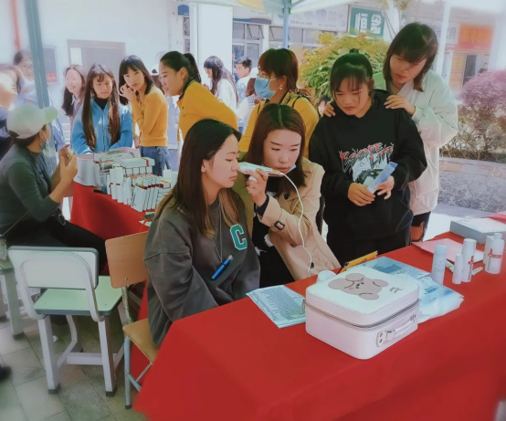 本次活动主要分为三个项目:医药护肤体验区、产品推荐区、化妆体验区。在活动中,由一心堂专业人员对同学们进行安全护理皮肤知识宣传,提供免费洗眼镜、化妆教程、护肤体验,并详细讲解了安全护肤的方法及修复受损肌肤的药品推荐。
