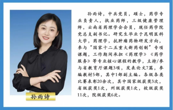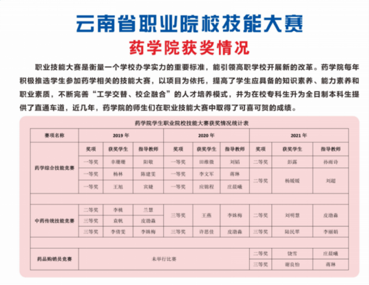 在学校1998年开办的中专药剂专业建设基础上,高职药学专业历经24年积淀,专业建设成果显著,为学校重点特色专业。我们始终将思想政治工作贯穿于药学专业人才培养的全过程,坚持党的领导,以落实立德树人为根本任务,将“三全育人”综合改革融入专业人才培养各环节,以培养高素质技术技能型药学人才为目标,不断探索,积极创新人才培养模式,先后构建了“工学结合”、“订单式”、“三入递进”等人才培养模式。2017年12月,药学专业成为云南省教育厅“现代学徒制”试点项目建设专业,2021年11月,荣获第一届云南省教学成果奖(职业教育)二等奖。