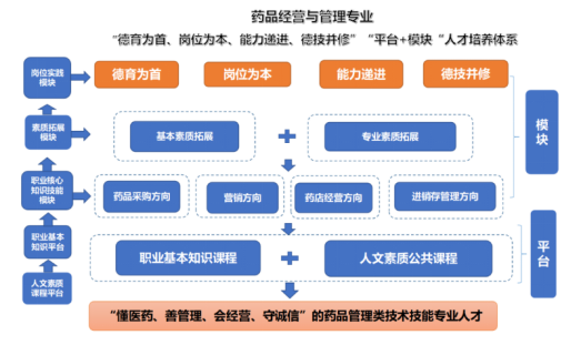 培养目标:药品经营与管理专业培养理想信念坚定,德、智、体、美、劳全面发展,具有一定的科学文化水平,良好的人文素养、 职业道德和创新意识,精益求精的工匠精神,较强的就业能力和可持续发展的能力,适应现代药品经营与管理一线岗位需要,掌握药品经营与管理专业所必需的基础理论知识、市场营销知识、企业管理基础知识和基本技能,面向医药生产企业、医疗器械批发企业、零售企业等企事业单位的执业药师、药品购销员、电子商务师、仓储管理员等职业群,能够从事药品购销、储运、养护、药品经营质量管理、药店经营、医药电子商务平台运营管理等工作的高素质技术技能人才。