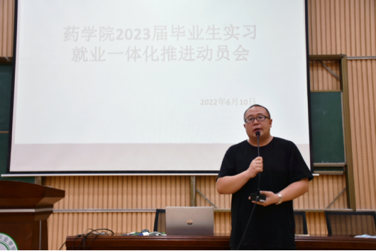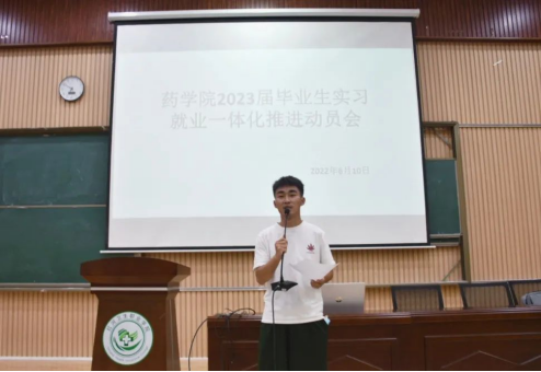 为确保2022年实习工作的顺利进行,也为全面贯彻落实学校“稳就业,保就业”决策部署,推动2023届毕业生实习工作的顺利展开。药学院于2022年6月10日晚在教学楼阶梯教室召开了“药学院2023届毕业生实习就业一体化推进动员会”。药学院院长阳敬、副院长李丽娟,辅导员陈俊松老师、保剑老师、欧阳秋雨老师以及药学院全体实习生参加了本次动员会。