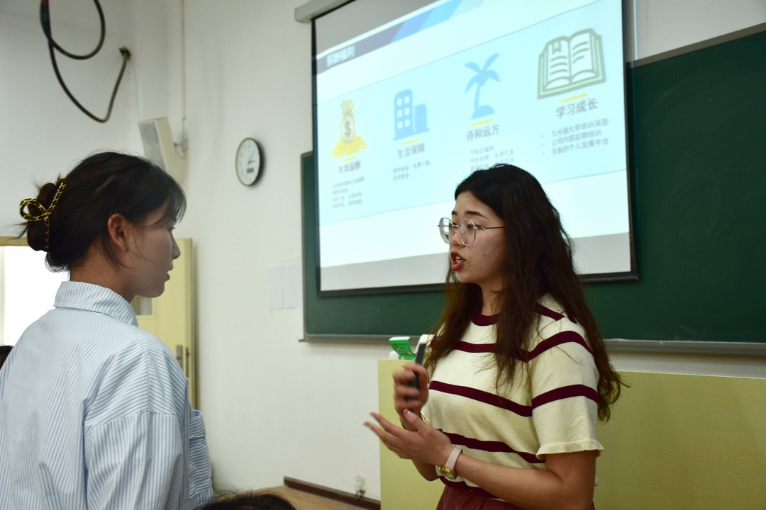 接着,冯专员就九州通公司的公司概况、公司文化、薪酬福利、实习期待遇、人才需求及发展空间等多方面多角度,介绍了公司的总体情况和用人岗位需求。在答疑环节,冯专员和黄经理就同学们的疑惑和顾虑耐心细致的给同学们进行答疑解惑。