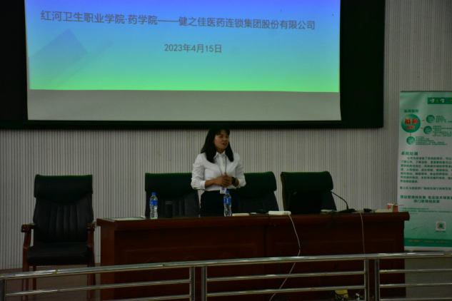 4月15日,药学院联合健之佳医药连锁集团股份有限公司,在学校实验实训楼报告厅开展产教融合实习就业一体化宣讲会。参加此次宣讲会的人员有,健之佳红河分部人事副经理曹钟慧、人事主管何艳花、人事专员李琴、就职于健之佳的药学院2023届毕业生,药学院领导、辅导员及2024届毕业生。会议由药学院副院长李丽娟主持。